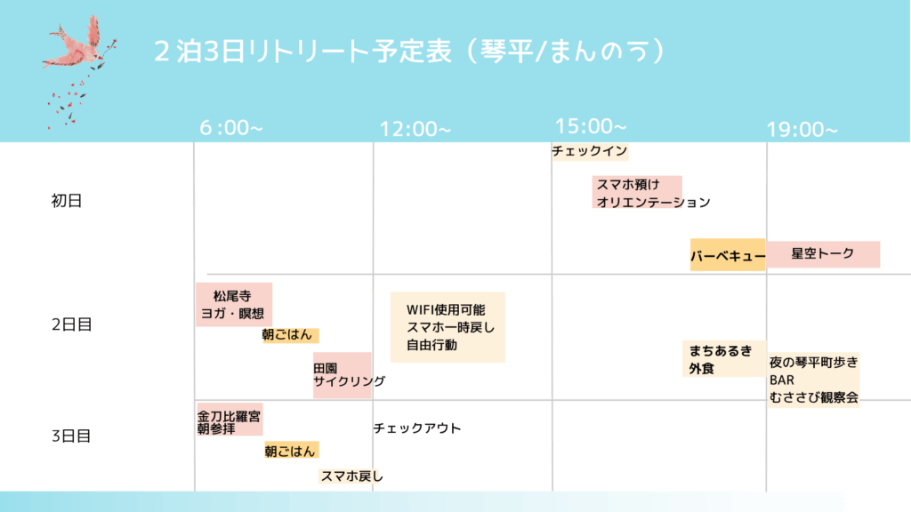 オンラインゼミやグループの懇親プラン 松尾寺(高野山真言宗・新四国曼荼羅霊場十六番)でヨガ 琴平のホステル"Cabin"の4F全体をお借りします 金刀比羅宮へ参拝 金倉川沿いをぶらぶら食べ歩き 夜のまち歩き 宿泊するCabinの1階はカフェ 琴平〜まんのう町でデジタルデトックスをしながら、懇親をはかるプランです。普段リモートでしか顔を合わせないグループのリアルな交流会としても、ご利用されてはいかがでしょうか? 以下モデルプランです(ご希望に応じて、スケジュールは変更できます。) ● 料金に含まれるもの・自然栽培の野菜や瀬戸内の美味しい魚やお肉のバーベキュ、朝食2食、計3食分・HRV計測・ヨガ瞑想、森林ガイド、星空散策・焚き火などのアクティビティ全般・保険(時期や地域のイベント開催によって、スケジュールは変更になります。) プラン名 オンラインゼミやグループの懇親プラン 料金 ¥49,800/ 人 料金に含まれないもの 飲食代(2日目昼と夜)、現地までの交通費。 お申し込み→
